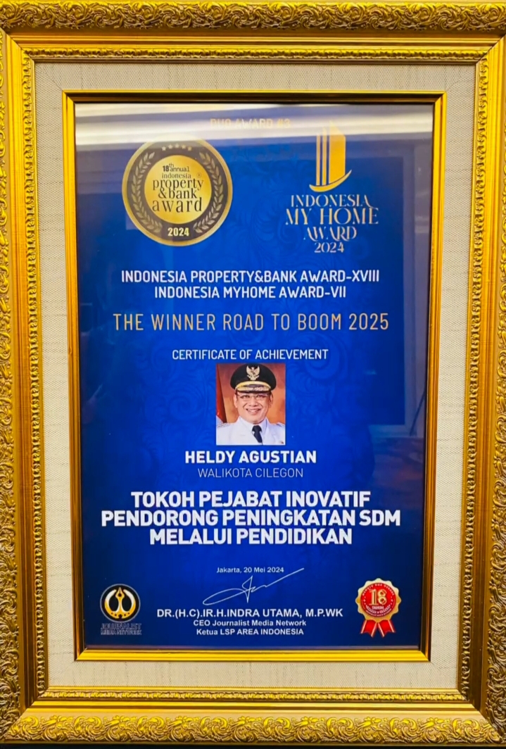 Cilegon,- Medianews.co.id,- Wali Kota Cilegon, Helldy Agustian, menerima penghargaan prestisius sebagai Tokoh Pejabat Inovatif dalam Peningkatan Sumber Daya Manusia melalui Pendidikan. Penghargaan tersebut diberikan oleh Majalah My Home Property dalam sebuah acara yang berlangsung di Jakarta pada hari Senin, 20 Mei 2024.