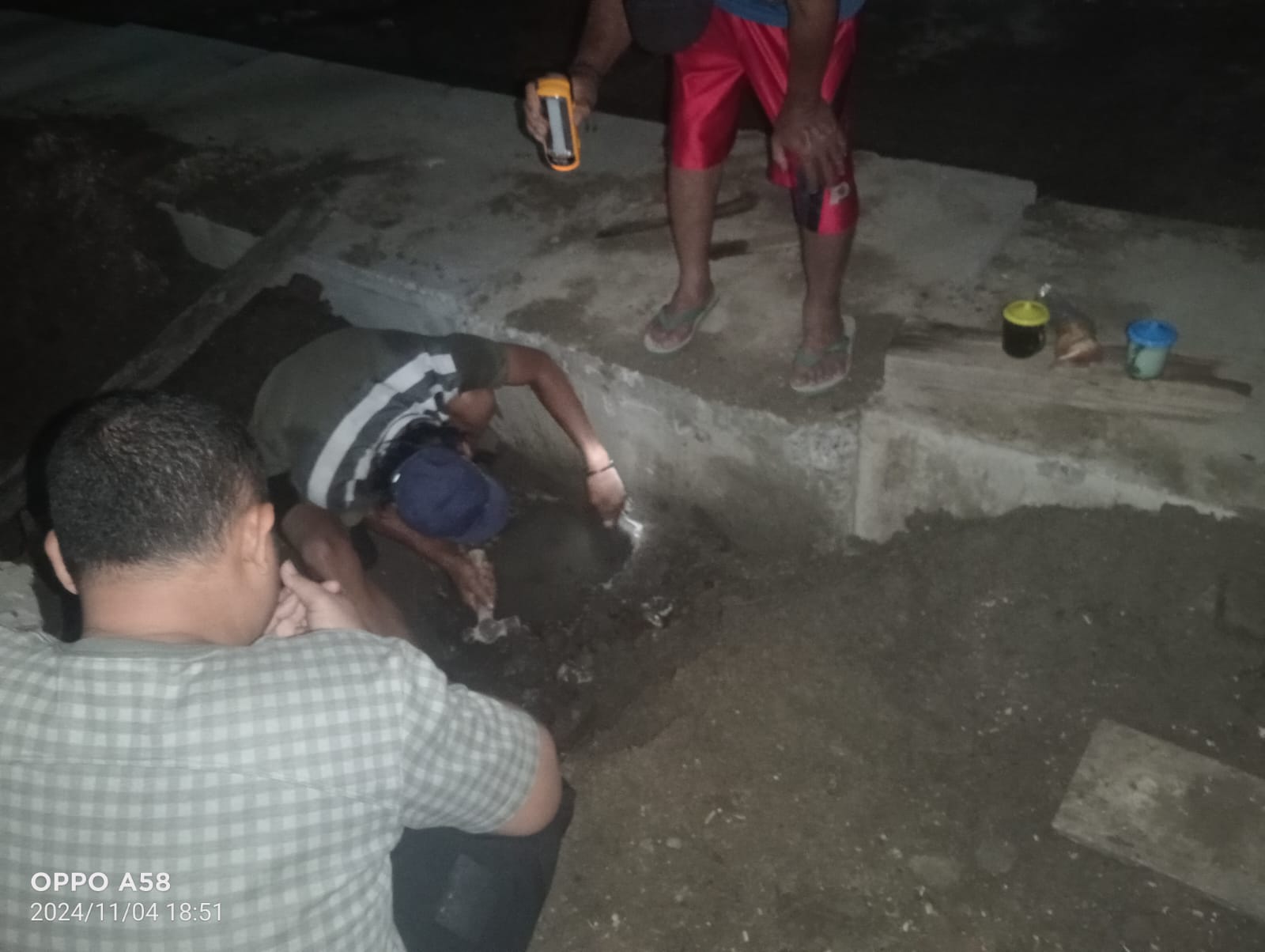 Dalam pantauan awak media pada hari Senin, 4 November 2024, terlihat sekelompok warga sedang melobangkan drainase menggunakan palu dan pahat Pada Jam 19:30 WIB Upaya ini dilakukan agar aliran air dapat kembali normal, menghindari genangan yang dapat menyebabkan bau busuk yang menyengat di lingkungan mereka.