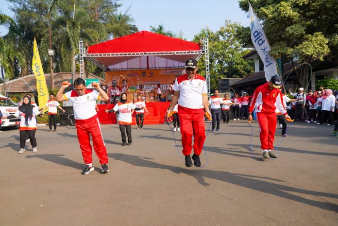 CILEGON,- Medianews.co.id,- Wali Kota Cilegon Helldy Agustian mengajak seluruh masyarakat untuk terus menumbuhkan pola hidup sehat, salah satunya melalui aktivitas olahraga. Hal itu disampaikan Helldy pada acara Peringatan Hari Olahraga Nasional (Haornas) 2023 di Halaman Kantor Wali Kota Cilegon, Rabu 4 Oktober 2023. Pada acara yang berlangsung sangat meriah dengan bertabur hadiah hiburan atau doorprize itu diawali dengan Senam Bersama dan dihadiri seluruh pejabat dilingkungan Pemerintah Kota (Pemkot) Cilegon dan Forum Komunikasi Pimpinan Daerah (Forkopimda) Kota Cilegon.