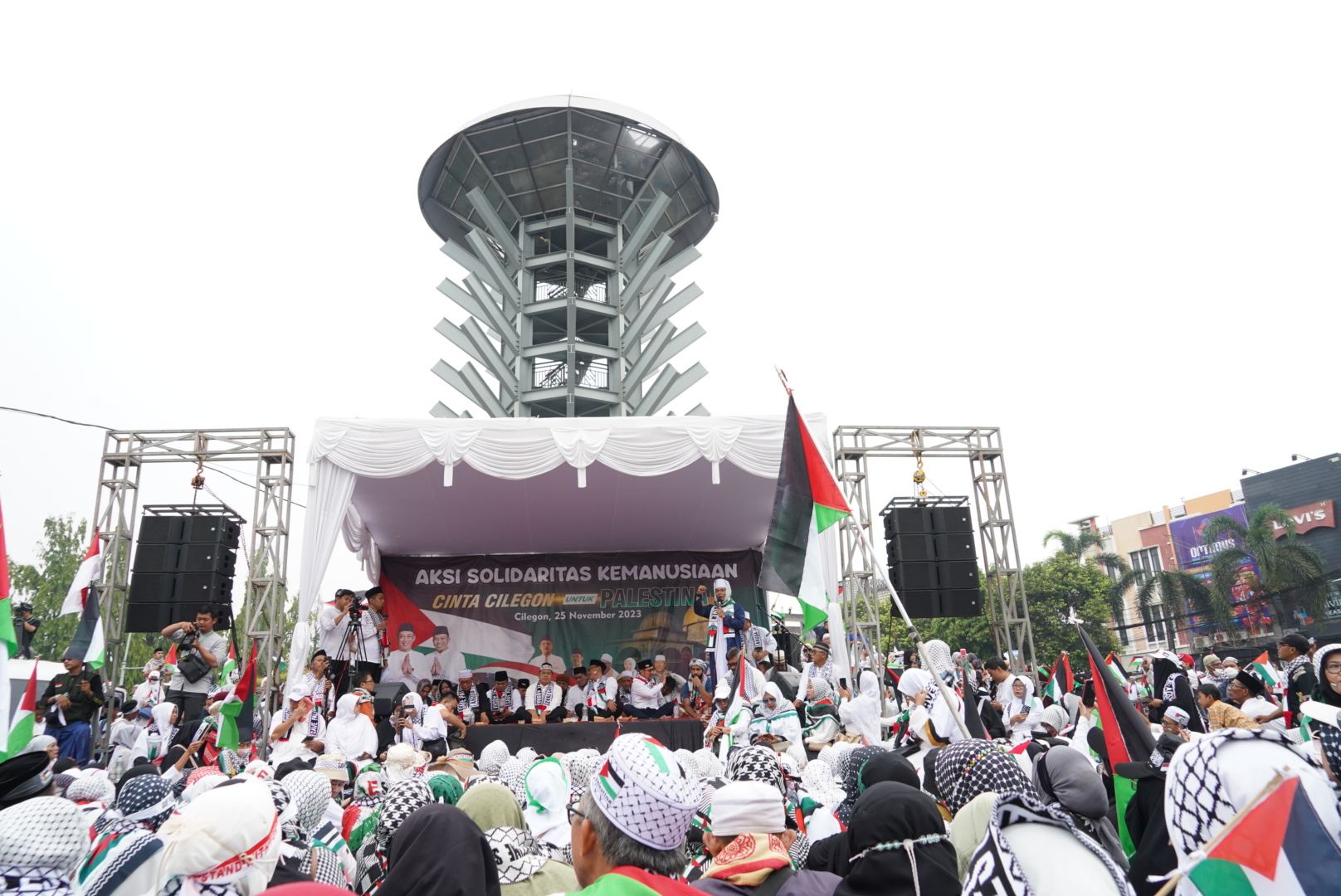 CILEGON,- Medianews.co.id,- Ribuan warga Kota Cilegon mengikuti Aksi Cinta Cilegon untuk Palestina, di Landmark, Simpang Tiga, Kota Cilegon, Sabtu 25 November 2023.