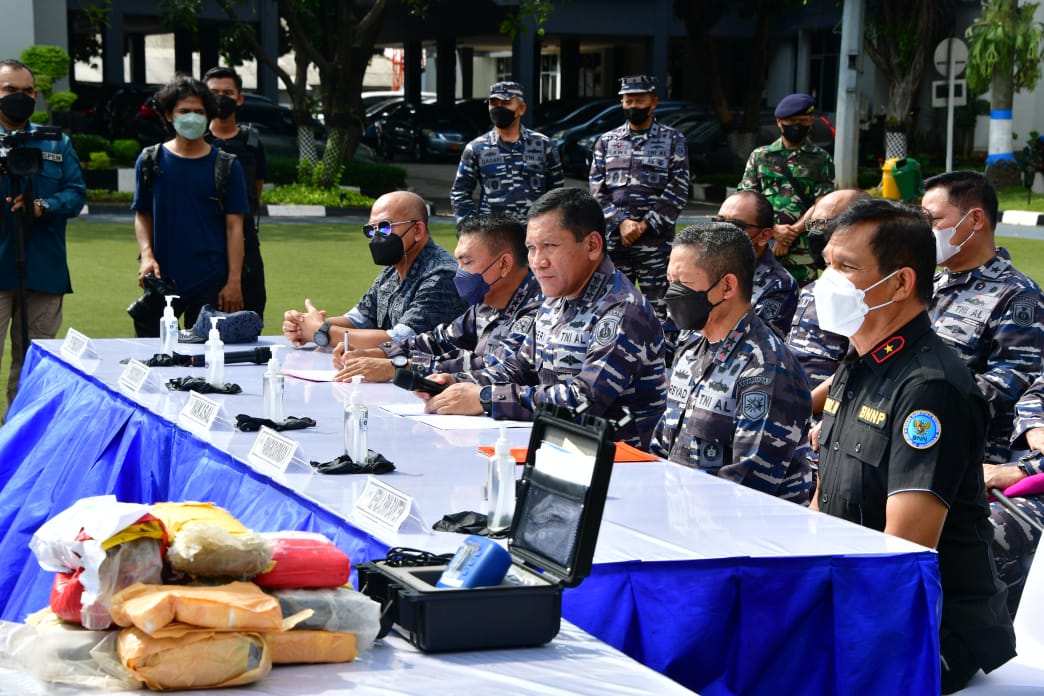 Wakil Kepala Staf Angkatan Laut (Wakasal) Laksamana Madya TNI Ahmadi Heri Purwono didampingi Panglima Komando Armada Republik Indonesia (Pangkoarmada RI) Laksamana Madya Agung Prasetiawan, Pangkoarmada I Laksamana Muda TNI Arsyad Abdullah, Kepala Deputi Pemberantasan BNN RI Irjen Pol Kennedy dan Kepala BNN Banten Brigjen Pol Hendri Marpaung menggelar konferensi pers di Koarmada I, Senin (09/05).