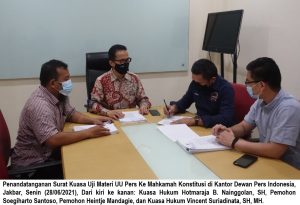 Jakarta,- Medianews.co.id,- Uji materi Undang-Undang Nomor 40 Tahun 1999 tentang Pers pekan depan segera didaftarkan ke Mahkamah Konstitusi (MK) menyusul surat kuasa para pemohon kepada para kuasa hukum yakni DR. Umbu Rauta, SH., M.Hum, Hotmaraja B. Nainggolan, SH., Nimrod Androiha, SH., Christo Laurenz Sanaky, SH., dan Vincent Suriadinata, SH., MH. yang tergabung dalam Mustika Raja Law Office telah resmi ditandatangani.